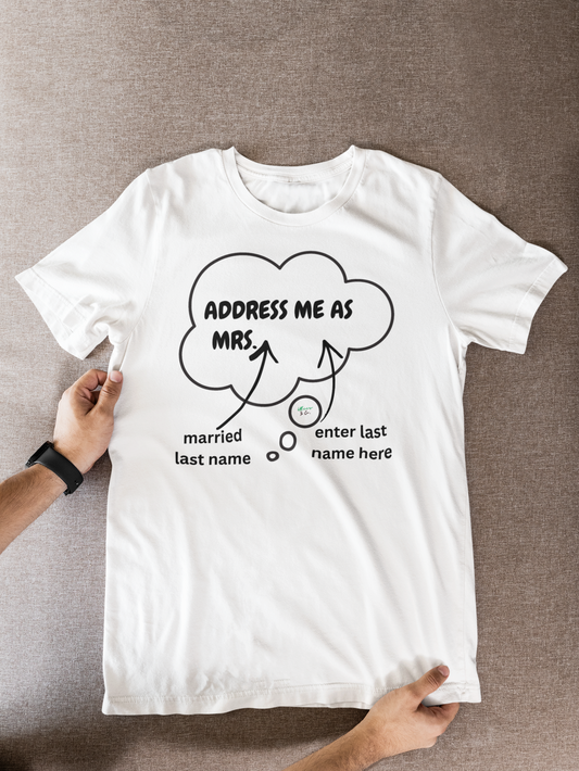 CUSTOM BRIDAL GIFT WEDDING T-SHIRTS GIFT FOR BRIDE ADDRESS ME AS MRS. EDWARDS GRAPHIC UNISEX T-SHIRT PERSONALIZED T-SHIRT IN THOUGHT BUBBLE GIFT FOR BACHELORETTE CUSTOM TEE FOR FINANCEE CUSTOMIZED GIFTS FOR WEDDING