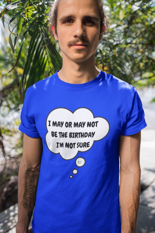 YOU THE BIRTHDAY VIRAL MEME I MAY OR MAY NOT BE THE BIRTHDAY IM NOT SURE T-SHIRT GRAPHIC UNISEX TSHIRT IN THOUGHT BUBBLE DESIGN FUNNY TEES SARCASTIC TSHIRTS JOKE SHIRTS FOR HER SOCIAL MEDIA MEME SHIRTS FOR HIM TRENDING MEME